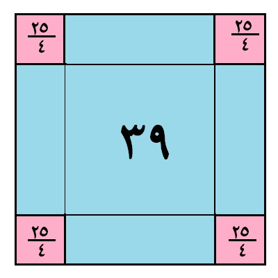 وبالتّالي مساحتة (مُربع الضلع) مساويةٌ لـ 2(x+5) وهذه المساحة من جهة أخرى مساويةٌ لمساحة المربع الأصلي مع المستطيلات الأربعة مضافةً إليها مساحةُ أربعة مربَّعات في الزاوايا الأربع ذوات أضلاعٍ متطابقة ومساوية لـ أي مساحة فتصبح مساحةُ المربع الخارجي معروفةً ومساويةً لـ 25 مضافاً إليها المساحةُ المستقاة من المعادلة والناشئةُ عن تمديد المربع الأصلي بأربعة مستطيلات والمساوية لـ 39 ، أي إن مساحة المربع الخارجي هي 25+39=64 ، وهذه مساحة مربع ذو ضلع مساوٍ لـ 8 ، ولكننا نعلم طول ضلع المربع الخارجي مما تم استنتاجه أعلاه وهي x+5 أي أن: